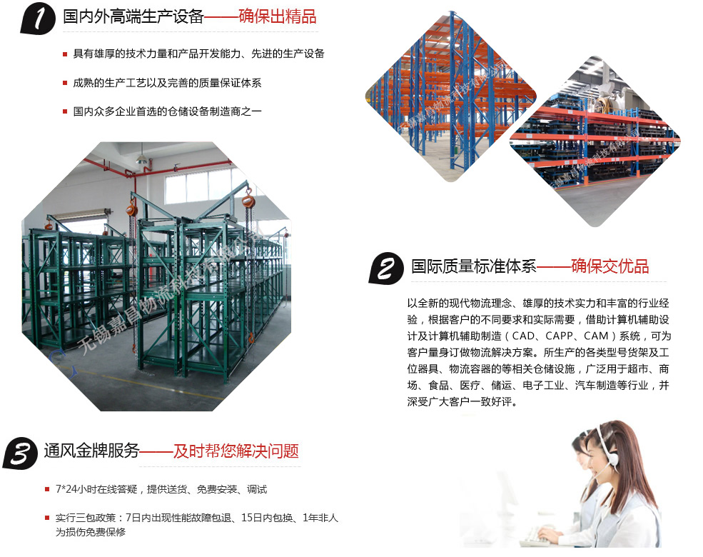 無錫嘉昌倉(cāng)儲(chǔ)貨架有限公司擁有多年的設(shè)計(jì)、生產(chǎn)、管理經(jīng)驗(yàn)。以全新的現(xiàn)代物流理念、雄厚的技術(shù)實(shí)力和豐富的行業(yè)經(jīng)驗(yàn),根據(jù)客戶的不同要求和實(shí)際需要,借助計(jì)算機(jī)輔助設(shè)計(jì)及計(jì)算機(jī)輔助制造(CAD、CAPP、CAM)系統(tǒng),可為客戶量身訂做物流解決方案。所生產(chǎn)的各類型號(hào)貨架及工位器具、物流容器的等相關(guān)倉(cāng)儲(chǔ)設(shè)施,廣泛用于超市、商場(chǎng)、食品、醫(yī)療、儲(chǔ)運(yùn)、電子工業(yè)、汽車制造等行業(yè),并深受廣大客戶一致好評(píng)。
